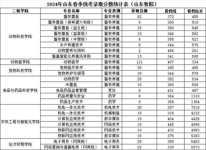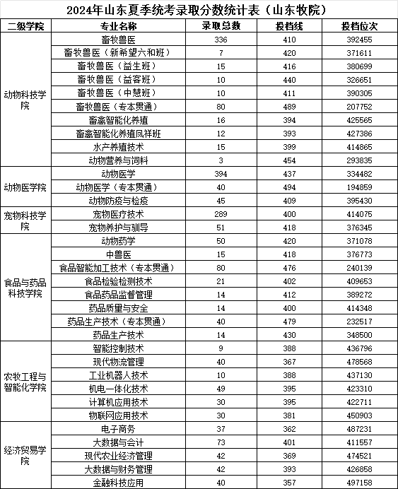 2024年山东夏季统考和春季统考投档分数和位次统计表