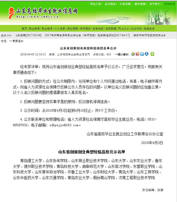 4月10日,山东省高校毕业生就业创业工作联席会议办公室公示了山东省创新创业典型经验高校名单,全省共有22所高校上榜,其中本科高校18所,高职院校4所,我校作为四所高职院校之一入选。