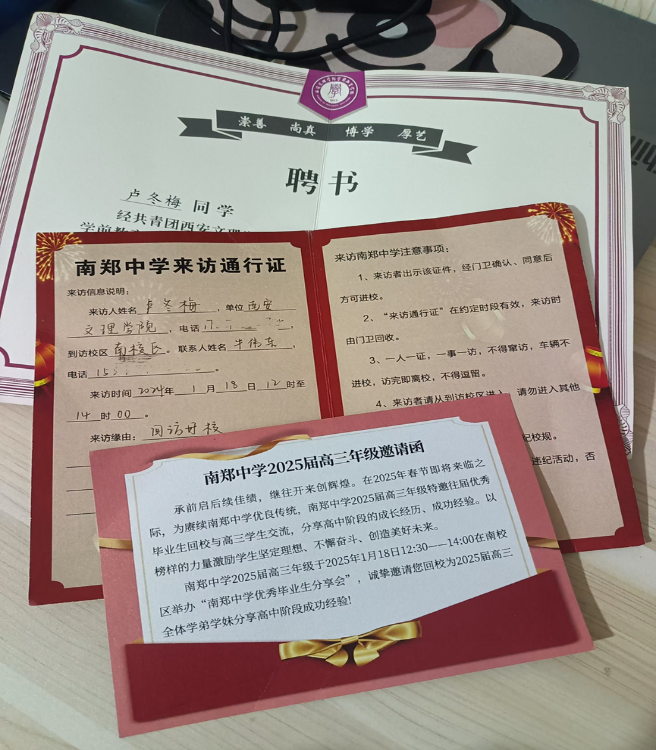 我在母校南郑中学开展了宣讲活动,见到了久未谋面的同学和老师,回到了那个熟悉的求学教室,回头看现在已是学前人。通过此次向老师、学弟学妹介绍大学生活等信息,从最初紧张到流畅表达,我的沟通应变能力得到了提升,组织语言能力也得到了锻炼。在准备此次宣讲材料,梳理自身大学生活的过程中,我也发现了自身的成长与不足。