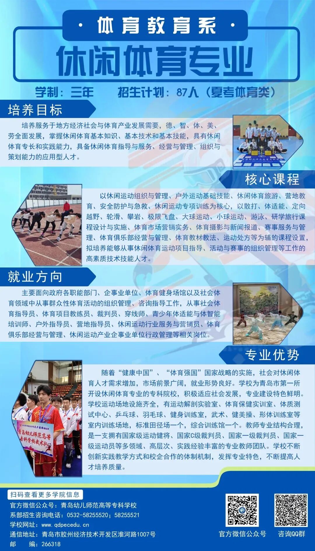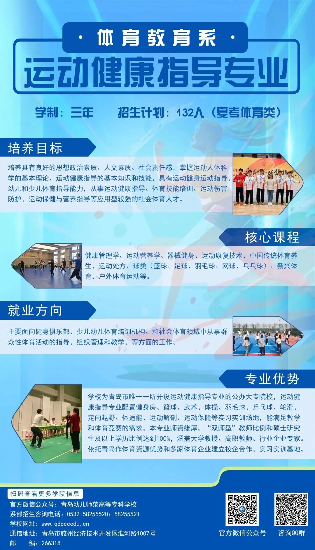 休闲体育专业和运动健康指导专业设置的初衷,一是根据中共中央国务院印发的《“健康中国2030”规划纲要》中积极倡导大力发展社会休闲体育和运动健康产业等相关规划;二是在调研中发现随着“健康中国”、“体育强国”国家战略的实施,社会对休闲体育和运动健康指导专业人才需求增加,市场前景广阔,就业形势良好;三是结合山东作为体育强省,体育产业非常发达,而体育专业人才相对紧缺的现状,作为新建的高职院校,理应担起“为党育人、为国育才、为学生谋前程”的重任。