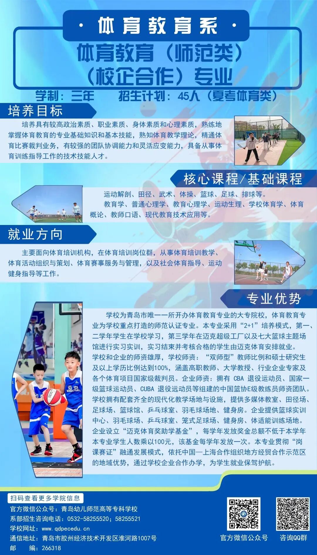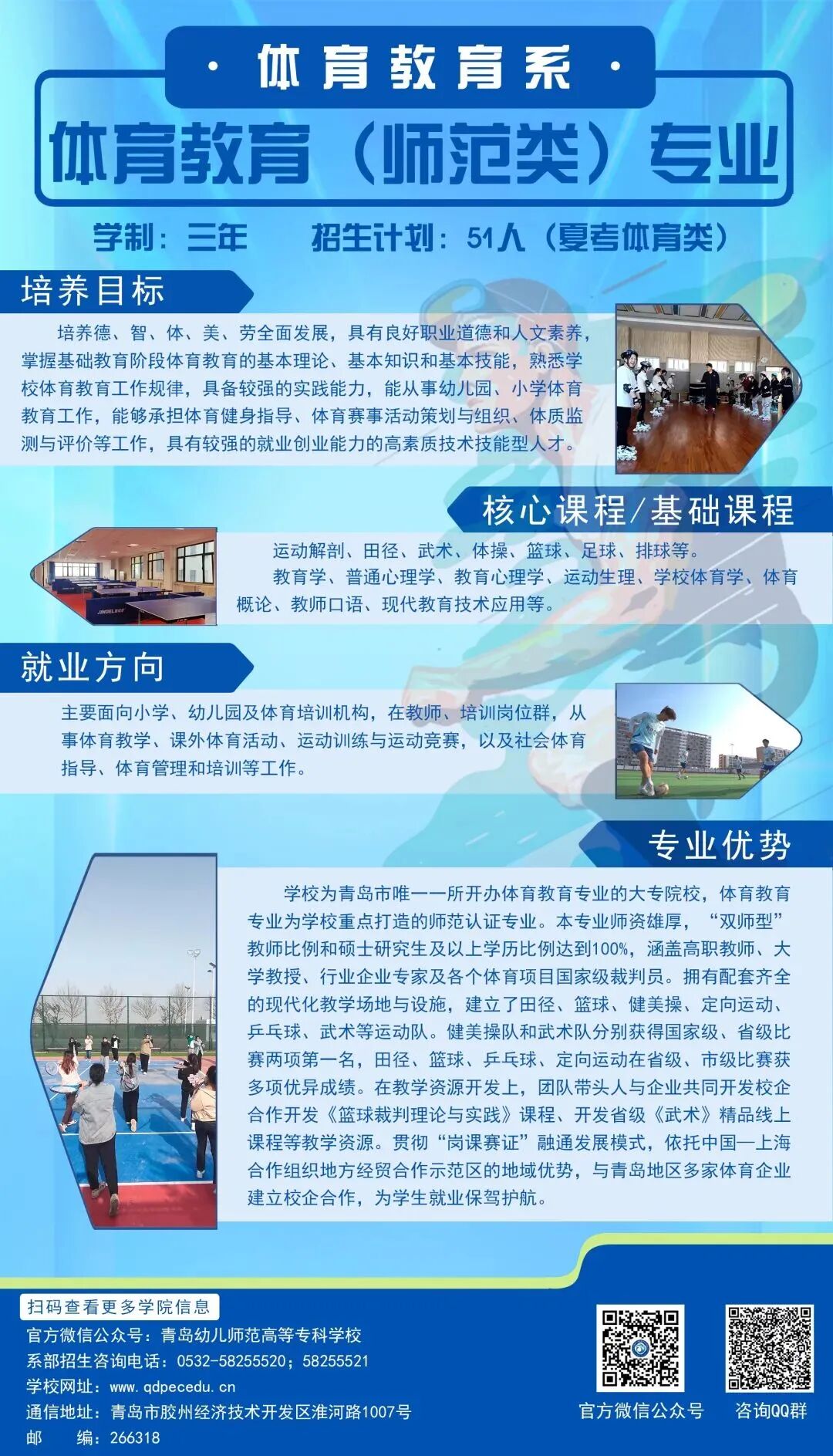体育教育专业培养德、智、体、美、劳全面发展,具有良好职业道德和人文素养,掌握基础教育阶段体育教育的基本理论、基本知识和基本技能,熟悉学校体育教育工作规律,具备较强的实践能力,能从事幼儿园、小学体育教育工作,能够承担体育健身指导、体育赛事活动策划与组织、体质监测与评价等工作,具有较强的就业创业能力的高素质技术技能型人才。