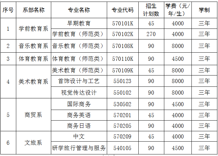 1.录取批次:学校所招12个专业高考招生类别皆为常规批(专科),其中体育教育专业招考批次为体育(不分文理),所有专业不限考试科目。