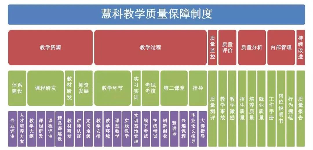 慧科集团已建立起科学、规范、完善的教学质量保障制度,从教学资源、教学过程、质量监控、质量评价与分析,到内部管理、持续改进等,多层次、多角度、全方位覆盖整个教学环节和活动,对教学的各个环节实施全面管理。