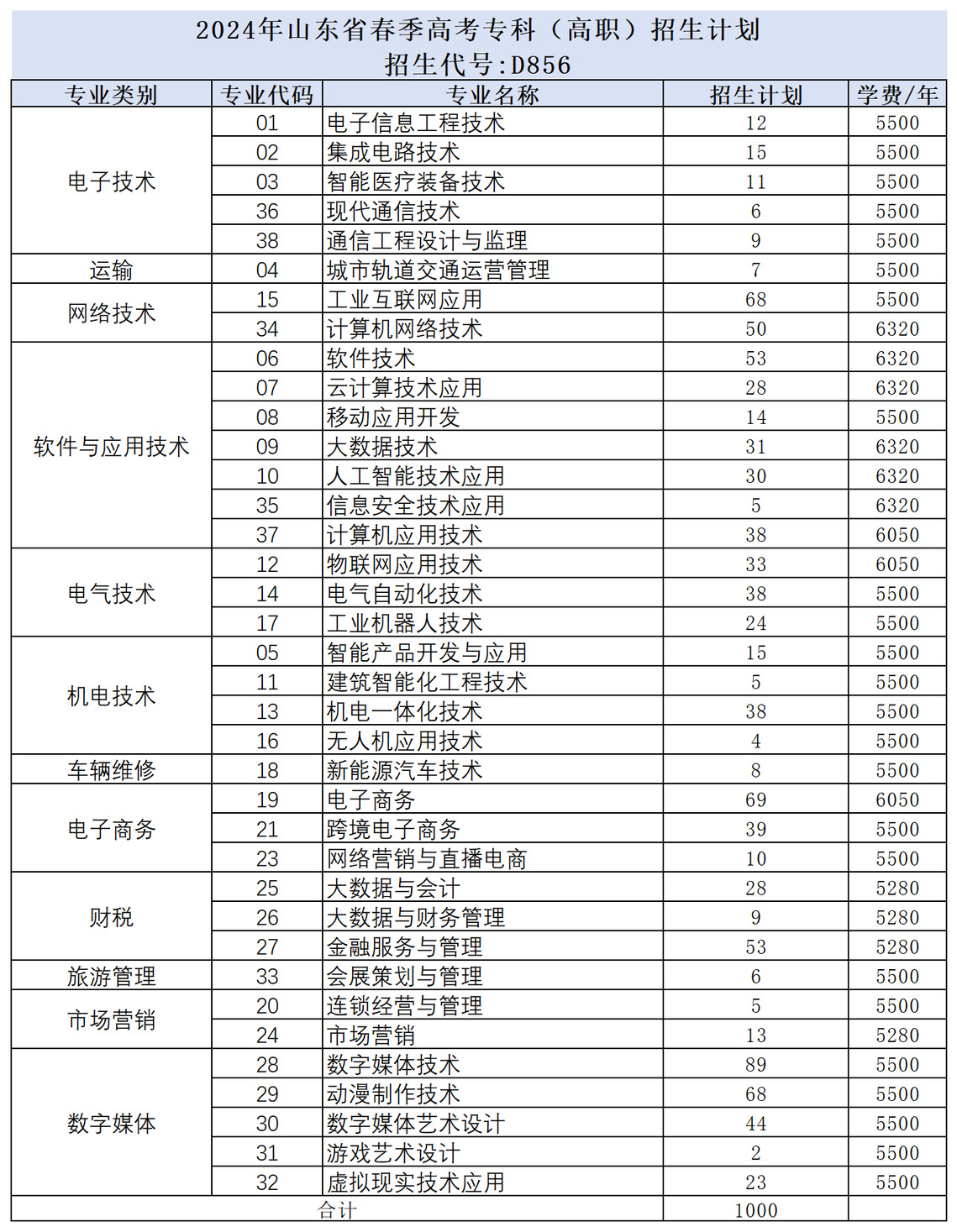 山东电子职业技术学院2024年山东省春季高考专科(高职)招生计划