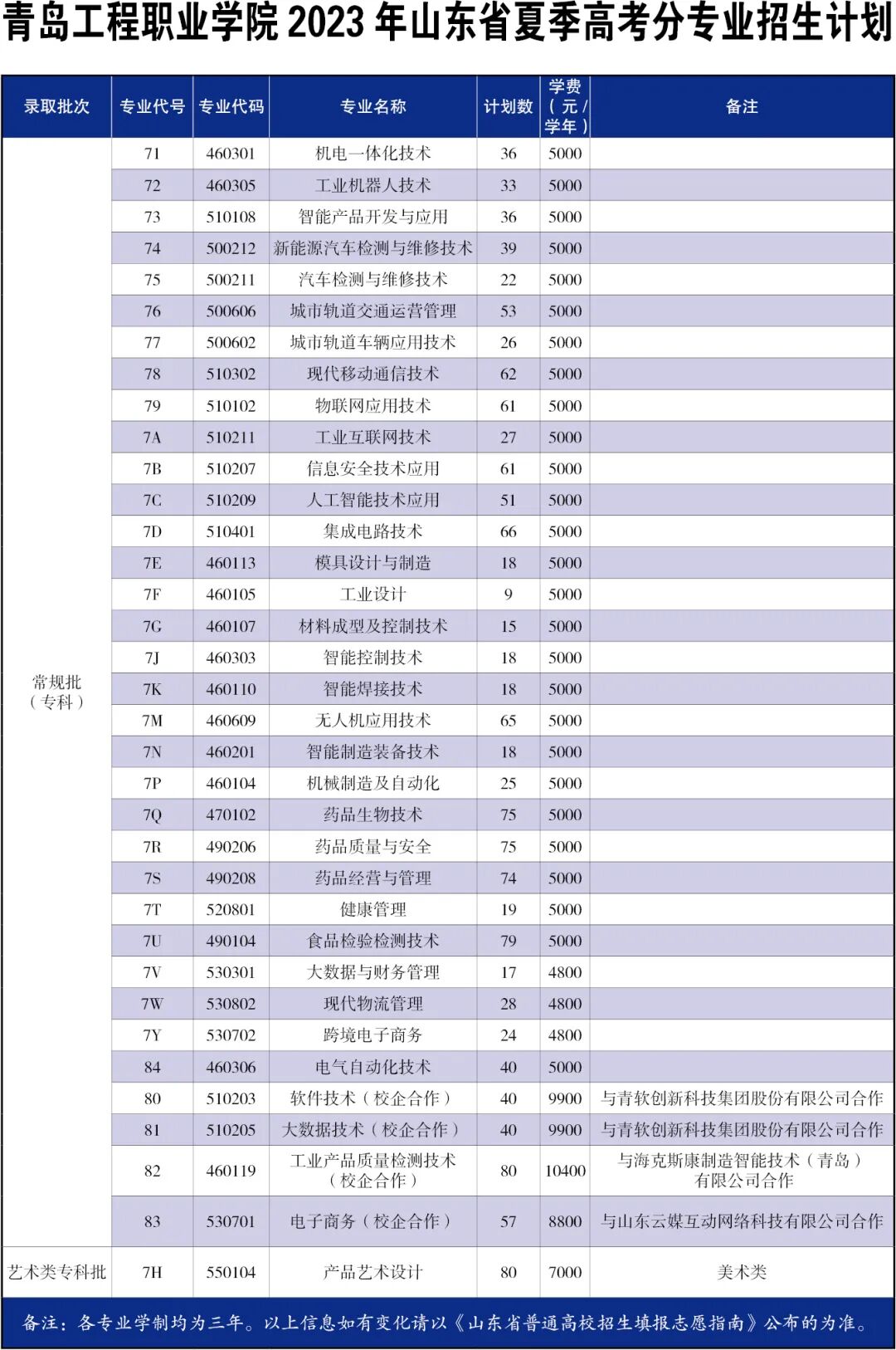 学院2023年面向山东省、河北省、山西省、江西省、四川省、云南省6个省份招生,招生总计划数为3743人。目前通过单独考试招生、综合评价招生、三二连读转段等形式,已完成招生计划数1566人;剩余计划数为2177人,其中夏季高考计划数1677人、春季高考计划数500人。