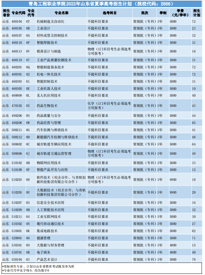 青岛工程职业学院2022年山东省招生计划(夏季高考)