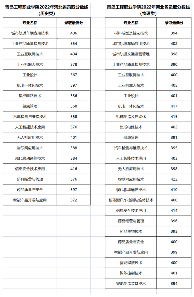 青岛工程职业学院2022年河北省录取分数