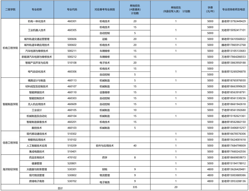青岛工程职业学院2024年单独招生和综合评价招生总计划500人,其中单独考试招生计划355人(普通类335人,退役军人类20人),综合评价招生计划145人。
