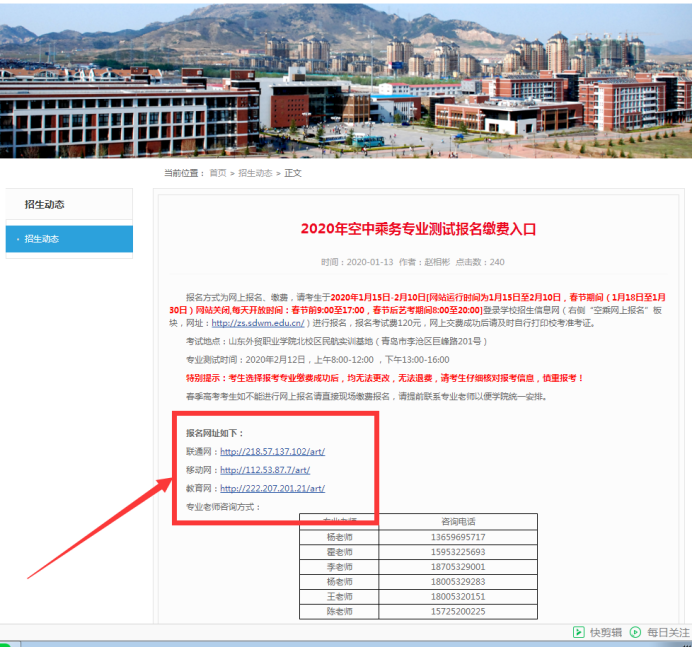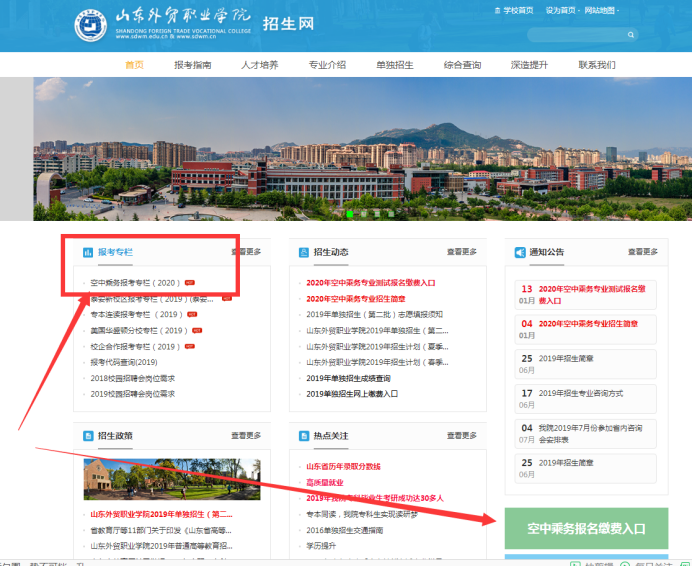 第二步,进入招生信息网,点击空中乘务报考专栏,或者直接点击学院招生信息网右侧“空中乘务报名缴费入口”板块。