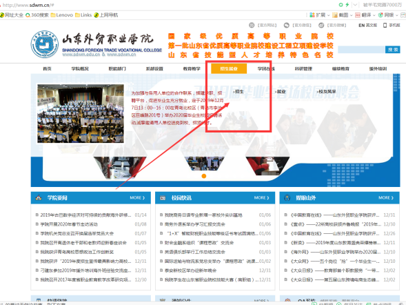 第一步,百度搜索山东外贸职业学院官网,进入山东外贸职业学院官网,点击菜单栏招生就业的招生,进入学院招生官网。(或地址栏直接输入:http://zs.sdwm.edu.cn)