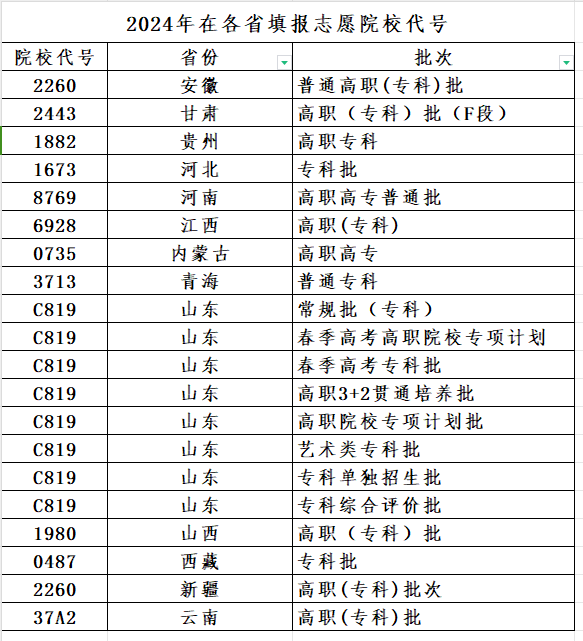 山东科技职业学院2024年在各省填报志愿报考代号及批次