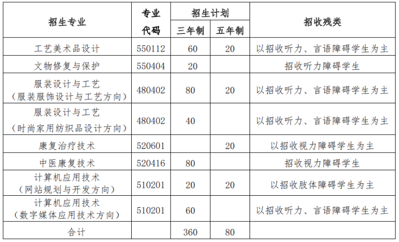 2024年残疾考生单独招生计划:三年制360人,五年制80人。