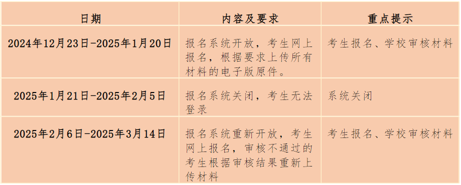 学院2025年残疾学生单独招生网上注册报名时间为2024年12月23日10:00--3月14日16:00,之后报名系统关闭,无法再注册报名或修改报考信息,请考生合理安排,以免贻误。