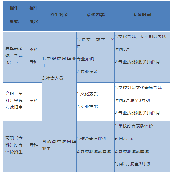 答:我省春季高考招生包括春季高考统一考试招生、高职(专科)单独考试招生和高职(专科)综合评价招生三种类型。各类考试招生对象、考核内容、考试时间请参照下表。