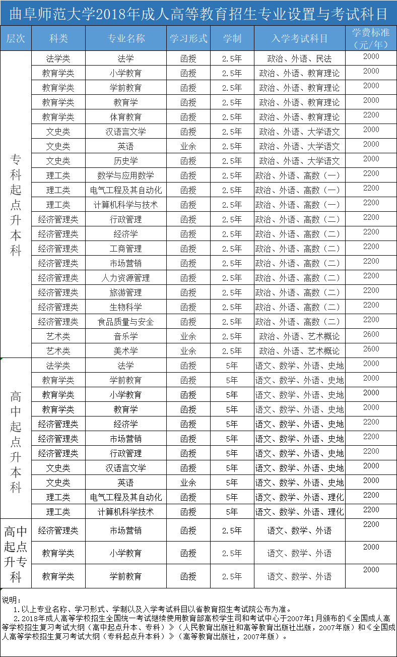 曲阜师范大学2018年成人高等教育招生专业设置与考试科目