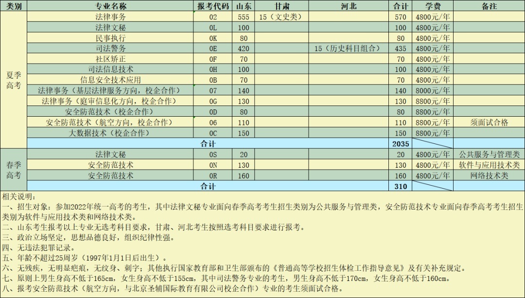 山东司法警官职业学院是山东省唯一一所警察类高等职业院校,始建于1982年,前身为山东省法律学校,2006年升格为职业学院,2009年被中央政法委、中组部、司法部等15部委确定为政法干警招录培养体制改革试点院校,2016年被省教育厅批准为“3+2”对口贯通分段培养试点院校,2018年被中央机构编制委员会、人社部、司法部等国家六部门确定为司法行政机关人民警察定向招录院校,2019年被山东省人力资源和社会保障厅批准为省级专业技术人员继续教育基地。先后加挂山东司法行政学院、山东律师学院、山东省委党校省司法厅分校牌子。实行学历教育与干部教育培训一体运行的办学体制。