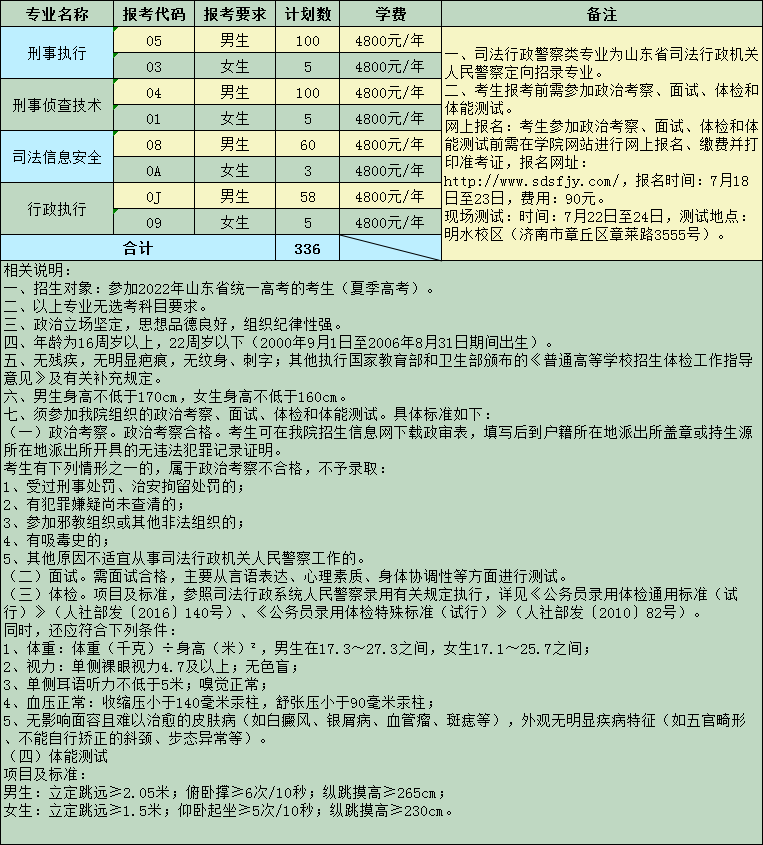网上报名:考生参加政治考察、面试、体检和体能测试前需在学院网站进行网上报名、缴费并打印准考证,报名网址:http://www.sdsfjy.com/,报名时间:7月18日至23日,费用:90元。