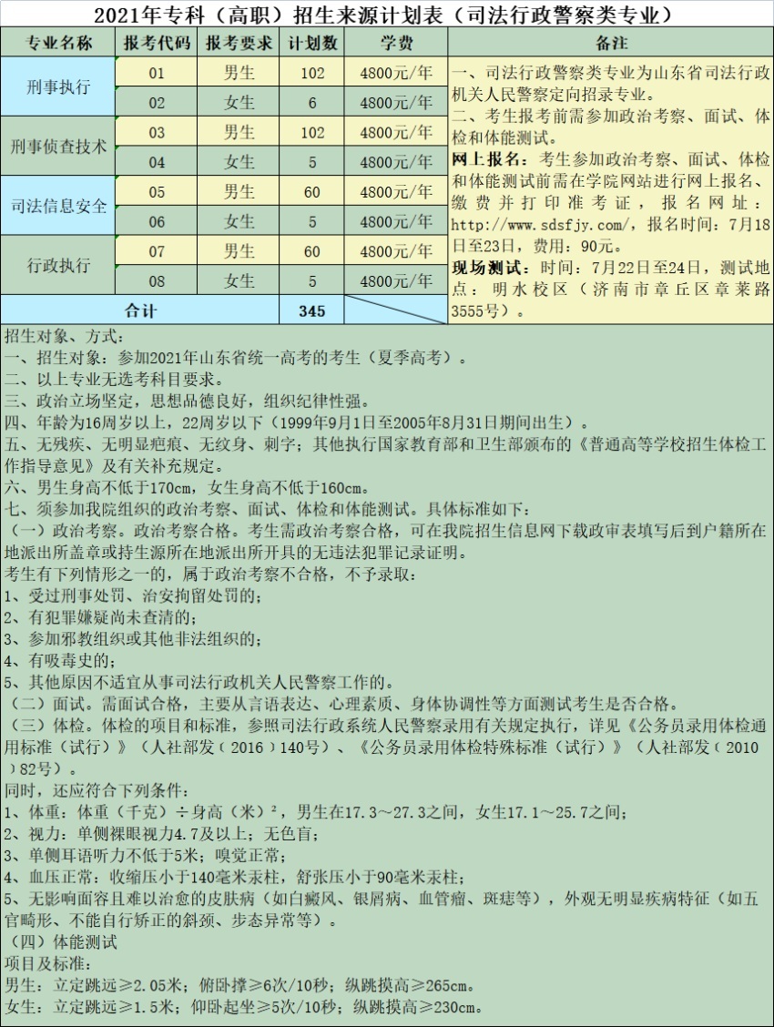 2021年专科(高职)招生来源计划表(司法行政警察类专业)