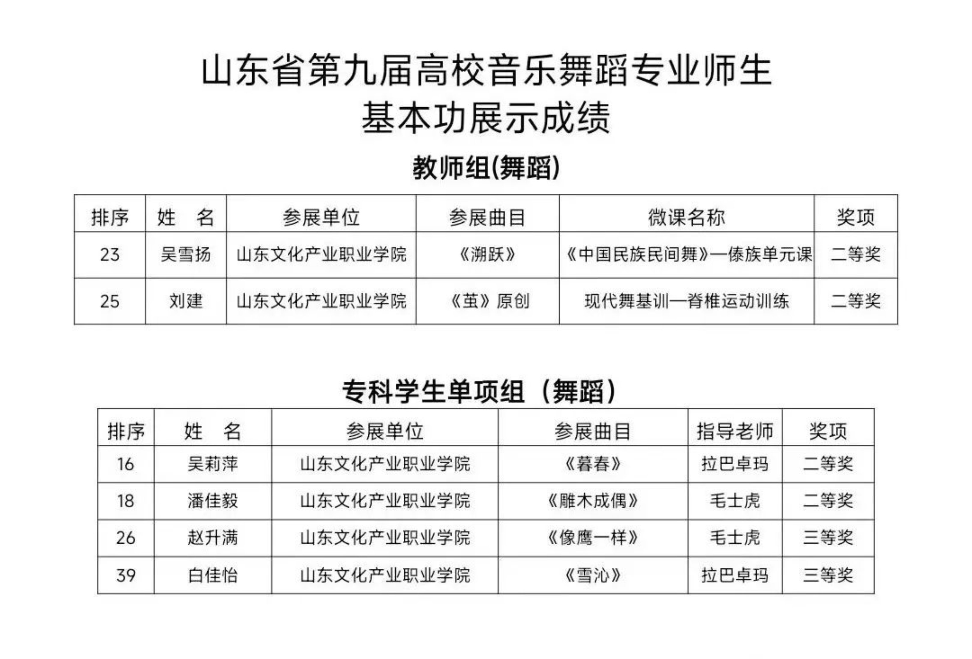 近日,由山东省教育厅主办的山东省第九届高校音乐舞蹈专业师生基本功展示在淄博举办。我校舞蹈学院师生积极备赛,荣获二等奖4项、三等奖2项。