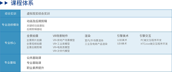 设计基础、数字图形创意、C# For Unity编程基础、虚拟现实交互开发技术、虚拟现实建模基础、VR全景拍摄实训、VR房地产场景制作及渲染、VR电商产品制作及渲染、VR次世代模型及材质制作、VR工业产品制作及渲染、U3D/UE4引擎美术及交互设计、U3D/UE4交互程序开发等。