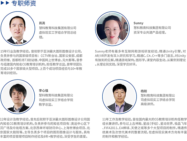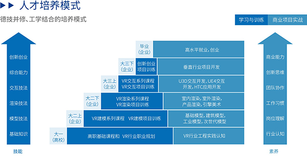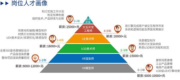 主要面向虚拟现实技术相关企事业单位,在VR全景拍摄、VR+地产、VR+教育、VR+电商、VR+汽车、VR+航天军事、VR+科技创新等领域,从事VR模型制作、VR渲染、VR 3D美术、UE美术、交互设计与开发相关岗位工作。