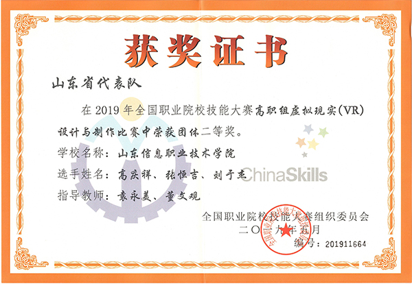 2019年在全国职业技能大赛“虚拟现实(VR)设计与制作”赛项中获得国赛二等奖,在2019年山东省职业技能大赛“虚拟现实(VR)设计与制作”赛项中获得省赛一等奖。