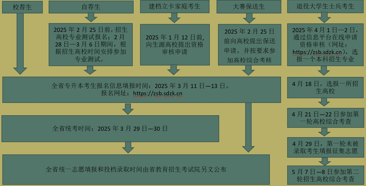 根据教育部有关通知精神,应征入伍地为山东省的退役大学生士兵(指普通专科毕业生及在校生应征入伍服兵役后退役,报名时为2025年应届专科毕业生或往届专科毕业生),可申请参加相关高校的退役大学生士兵免试专升本招生(不得兼报全省统一考试专升本)。符合条件的退役大学生士兵在线申请资格审核,经招生考试部门及退役军人事务部门审核并公示后,获得退役大学生士兵考生资格。退役大学生士兵考生须根据本人专科毕业专业和专业指导目录选报1个本科招生专业,一经确定不得更改。