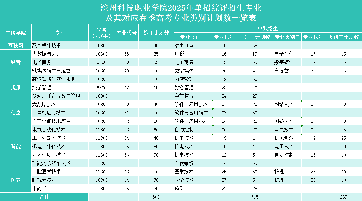 滨州科技职业学院2025年单招综评招生专业及其对应春季高考专业类别计划数一览表