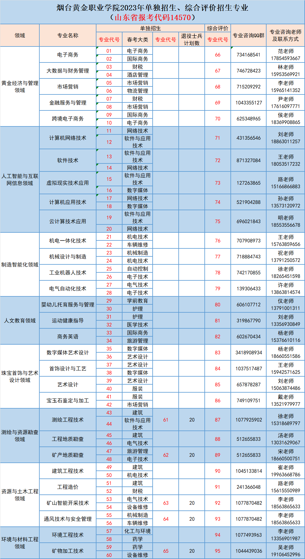 共3道题,每题10分共 30分,考试时间30分钟。题型为问答题,由系统抽取考试题目,学生录制视频后上传到考试系统。五、烟台黄金职业学院单招、综评专业和计划数我院2023年单独招生和综合评价招生计划共2340人,相比省内其他院校我院单招综评招生计划投放较多,录取竞争压力相对较小,请各位考生踊跃报考,烟台黄金职业学院2023年单招综评共有30个招生专业,具体招生专业见下图。