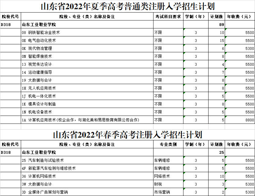 山东工业职业学院2022年注册入学招生计划