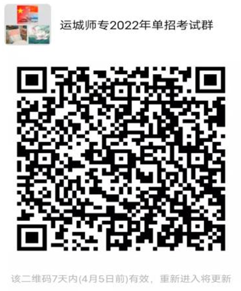 - 各位考生于4月5日之前,需电话联系我校招生办(0359-2877666,18835990003),或者通过手机微信扫下方二维码,经信息核实后,进入我校2022年单独招生考试专群;