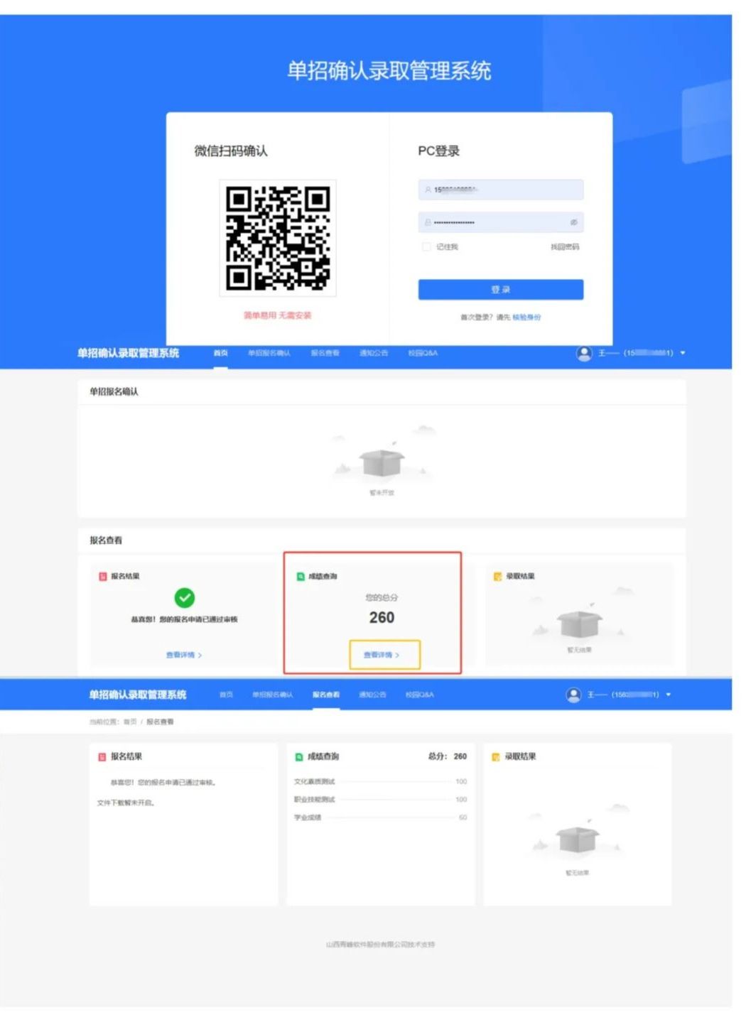 电脑端:登录“山西省财政税务专科学校招生信息网”(https://www.sxftc.edu.cn/zsxx/index.htm),点击“单招确认”进入登录注册页。登录成功后,点击“报名查看”可进行成绩查询。
