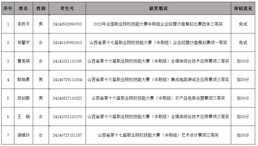 根据《山西省财政税务专科学校2024年单独招生章程》规定,现将参加2024年我校单独招生考试申请免试(加分)的考生资格审核结果予以公示,如对审核结果有异议的,可实名向我校招生就业中心反映。