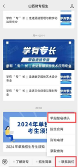 手机端:微信搜索关注“山西财专招生”公众号,点击“联系我们”,选择“单招报名确认”进入登录注册页。