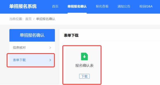 报名确认后,点击“表单下载”进行相关表项下载;(2024年单独招生考生报考登记表、2024年单独招生免试(加分)申请表、2024年单独招生体育特长生测试申请表等。)