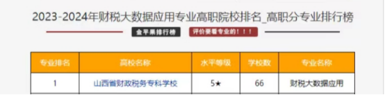 财税大数据应用专业的前身是税务专业,自2021年改名为财税大数据应用专业。在“金平果”发布的2023年中国高职院校竞争力排行榜中,财税大数据应用专业在全国66个开设同专业学校中名列第一。