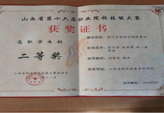 ⑤荣获全国大学生银行综合业务技能大赛团体一等奖一次、山西省职业院校技能大赛高职组银行业务综合技能比赛团体二等奖两次。