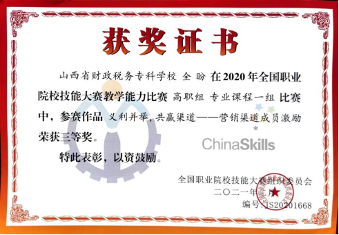 教学成果奖:2022年全国教学成果奖一等奖;2021年山西省教学成果奖特等奖;课程建设:“营销渠道开发与管理”获评2022年国家级在线开放精品课程、山西省在线开放精品课程;规划教材:国家“十三五”规划教材4部、“十四五”规划教材3部;省级“十四五”规划教材3部;教师教学能力竞赛获奖:全国职业院校教学能力竞赛三等奖;山西省职业院校教学能力竞赛一等奖;学生职业技能大赛获奖:全国职业院校技能大赛市场营销赛项一等奖1项、三等奖3项;山西省职业院校技能大赛市场营销赛项一等奖3项、二三等奖十余项;全国高等院校数字营销大赛一等奖;全国直播电商创新创业大赛三等奖;全国大学生市场调查与分析大赛三等奖。