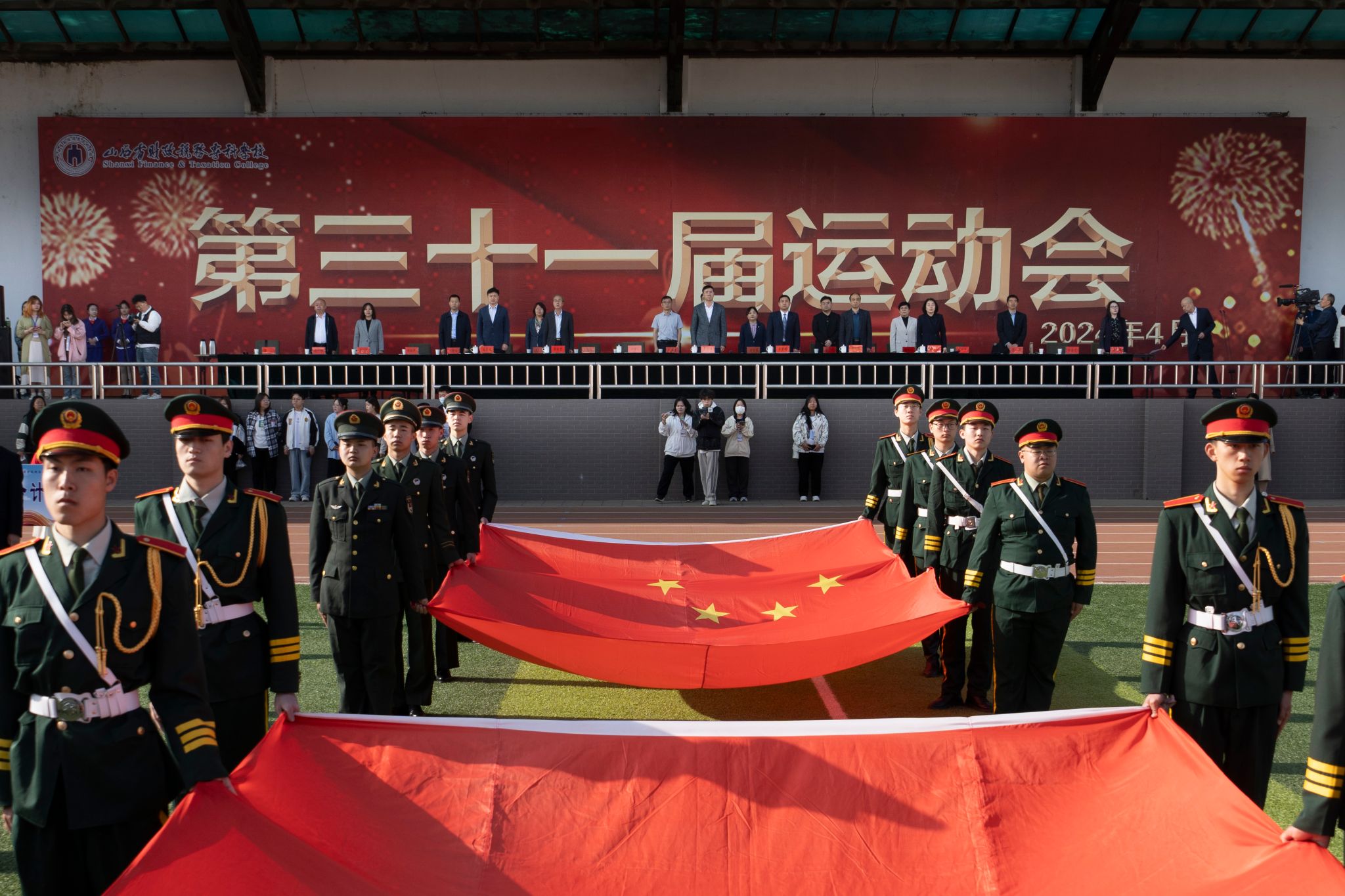 校党委书记秦华伟宣布运动会开幕。体育教学部靖新超、文化旅游学院2023级学生赵海燕分别代表裁判员和运动员宣誓。开幕式上,各学院大型团体操表演为广大师生呈现了青春洋溢的视听盛宴,教工代表表演了具有浓厚民族特色的健身气功八段锦。