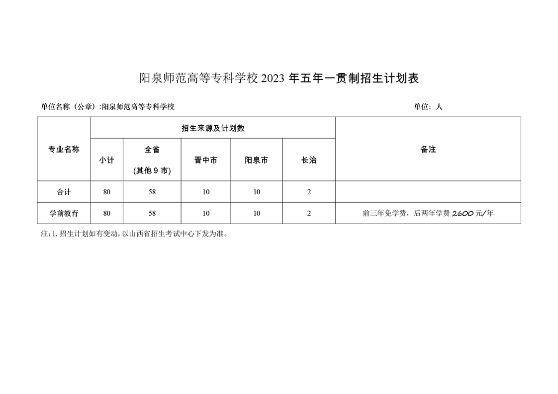 阳泉师范高等专科学校2023年中等职业教育招生计划表