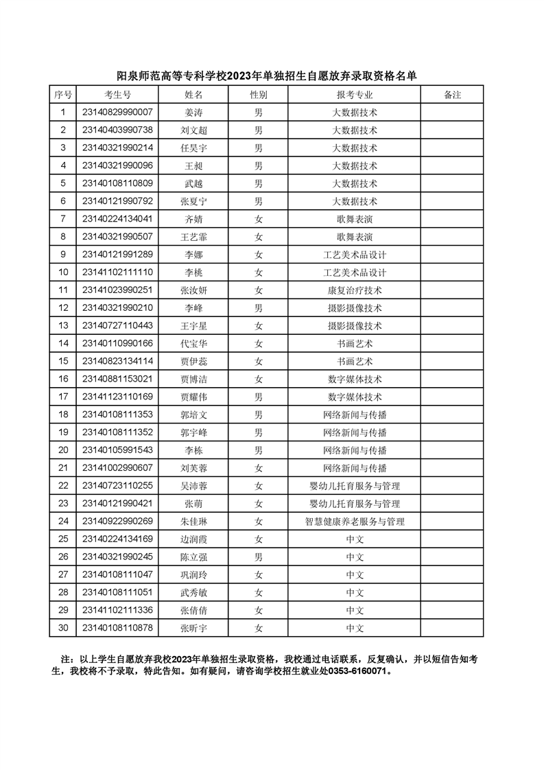阳泉师范高等专科学校2023年单独招生自愿放弃录取资格名单