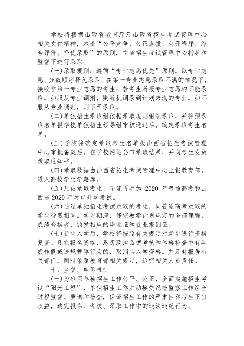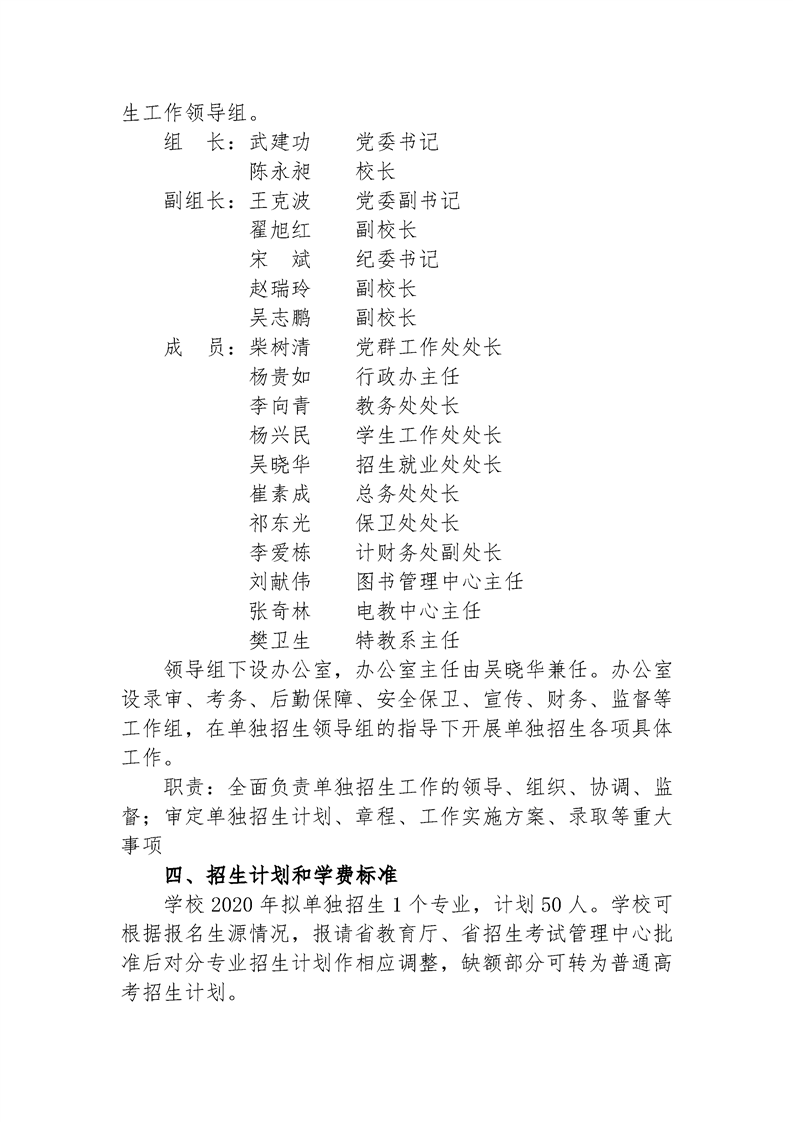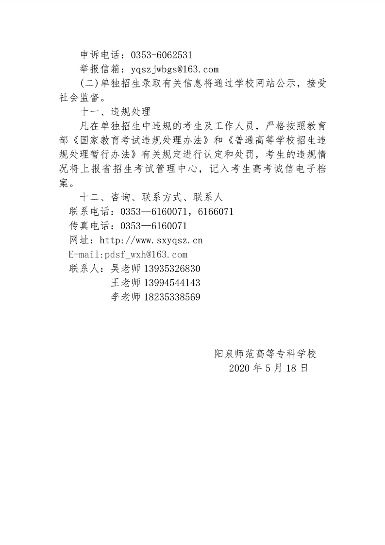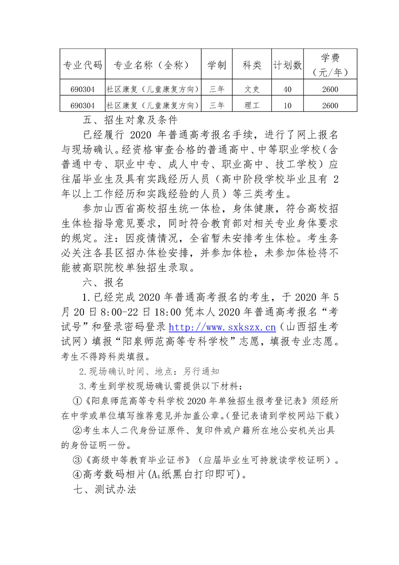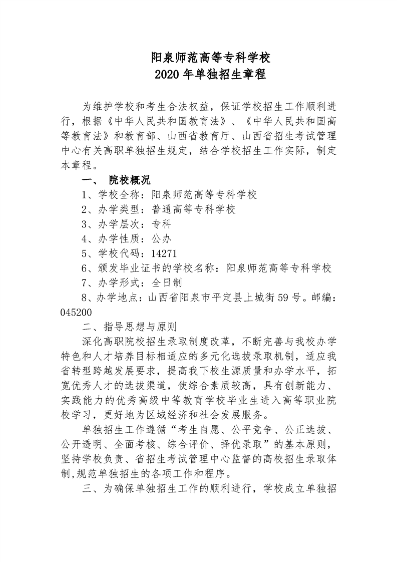 阳泉师范高等专科学校2020年单独招生章程