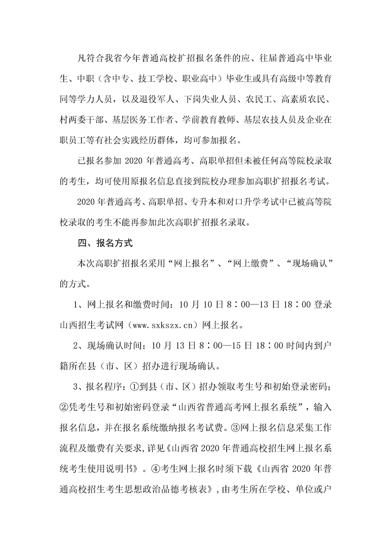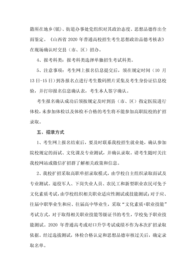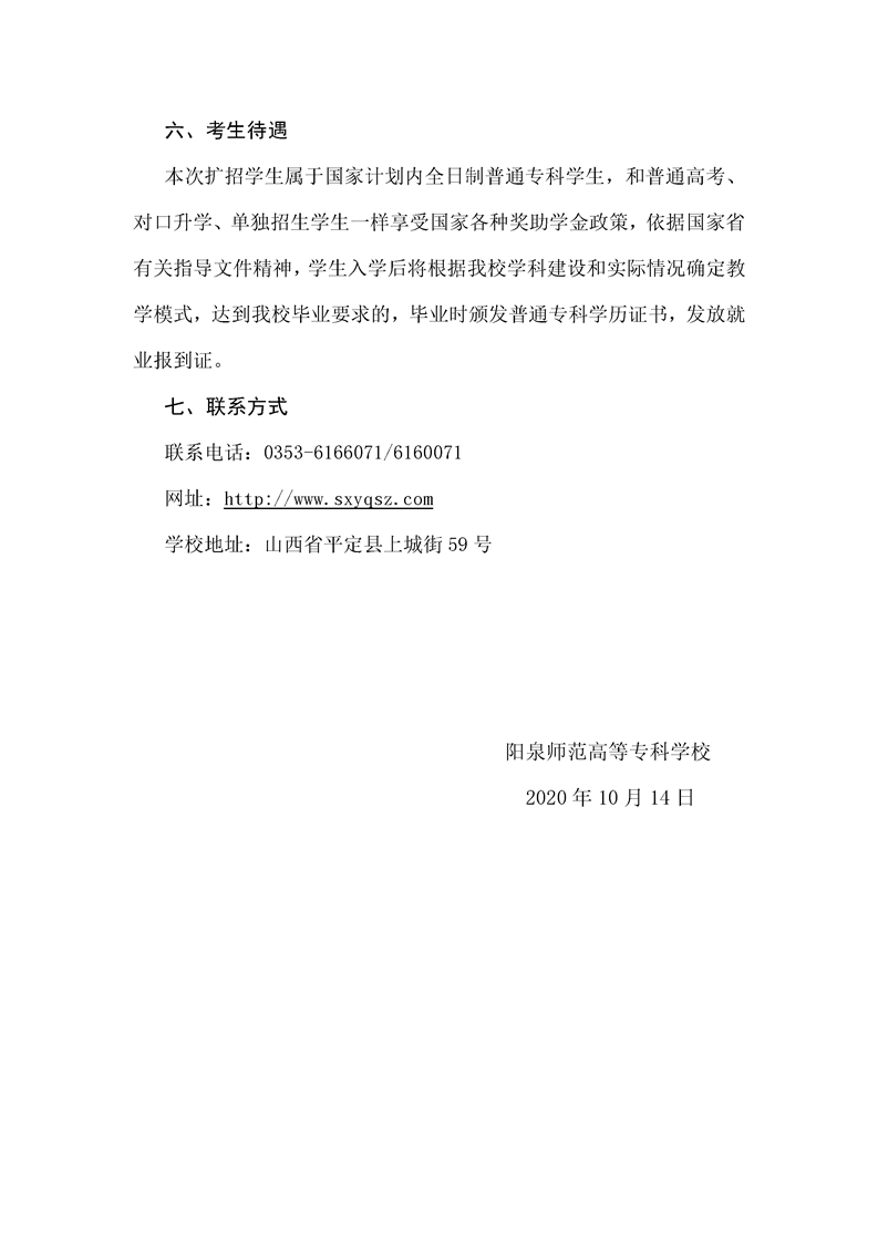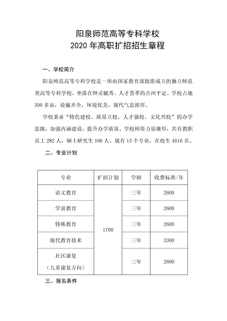 阳泉师范高等专科学校2020年高职扩招招生章程