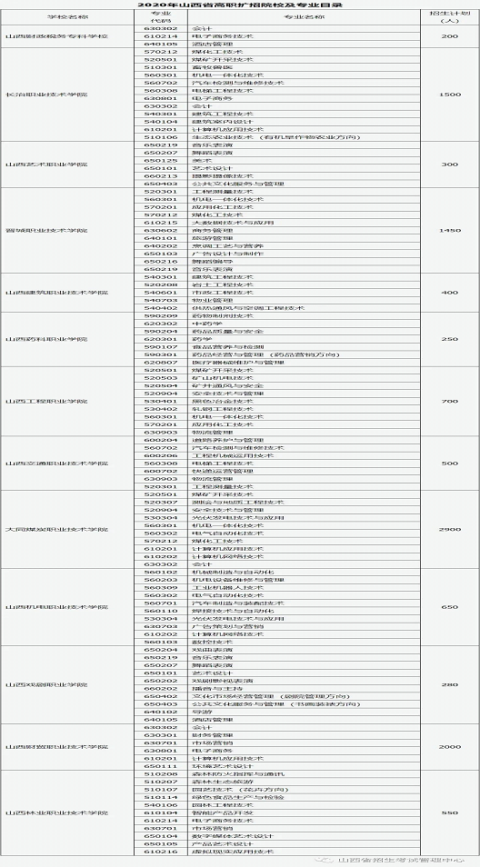 为贯彻落实《教育部办公厅等六部门关于做好2020年高职扩招专项工作的通知》(教职厅〔2020〕2号)文件精神,根据《山西省教育厅等七部门关于做好2020年高职扩招专项工作的通知》(晋教职成〔2020〕10号)文件要求,为做好2020年高职院校扩招专项工作,确保高职院校扩招专项工作依法、规范、公平、公正、有序进行,现将2020年高职院校扩招专项工作有关事项通知如下。