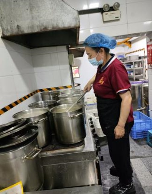 为了让同学们喝到清凉可口的绿豆汤,城市学院西餐厅阿姨早上五点多就开始准备,将绿豆洗净、浸泡,小火熬制一个多小时,加入冰糖,搅拌均匀,放到开有空调的大厅,冷却包装后,再送到操场供大家享用。