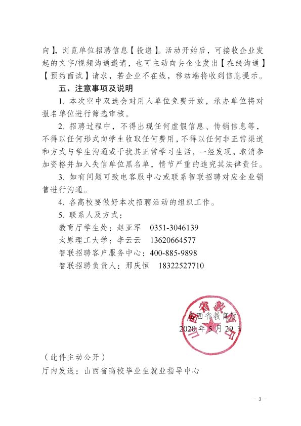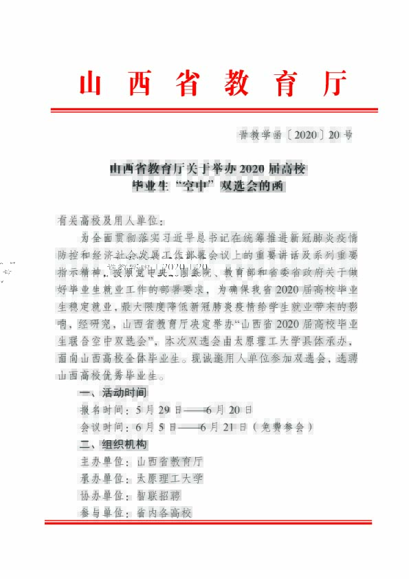 转发关于《山西省教育厅关于举办 2020 届高校毕业生“空中”双选会的函》