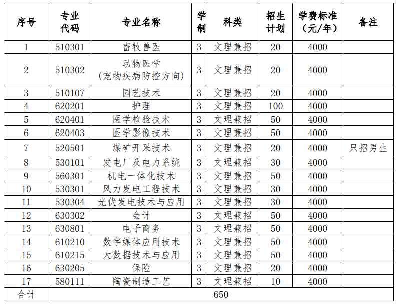 2021年单独招生共17个专业650人,学院根据生源情况,报请省教育厅、省招生考试管理中心批准后对招生计划作相应调整。