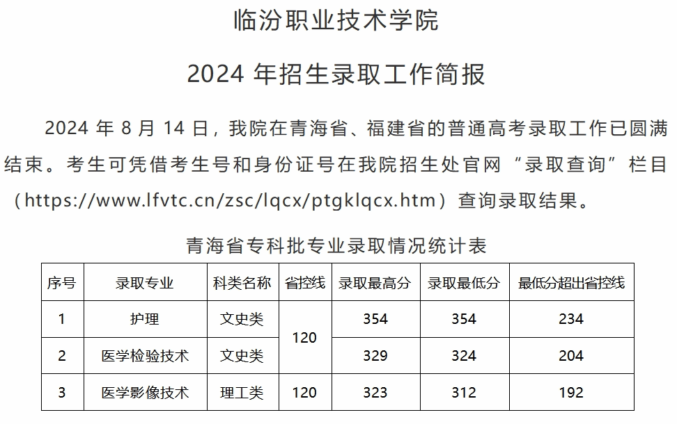 临汾职业技术学院2024年招生录取工作简报(青海省、福建省)