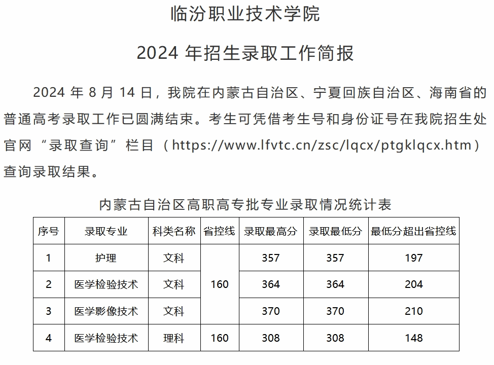 临汾职业技术学院2024年招生录取工作简报(内蒙古自治区、宁夏回族自治区、海南省)