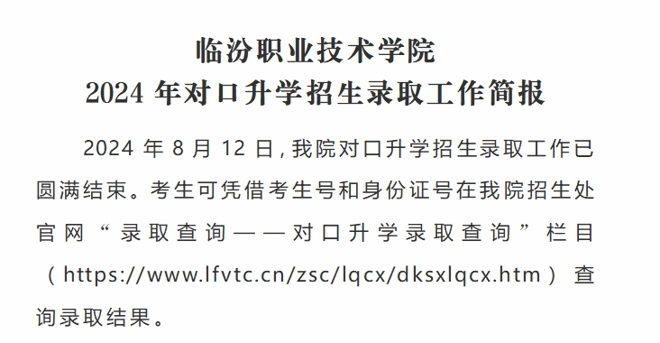 临汾职业技术学院2024年对口升学招生录取工作简报